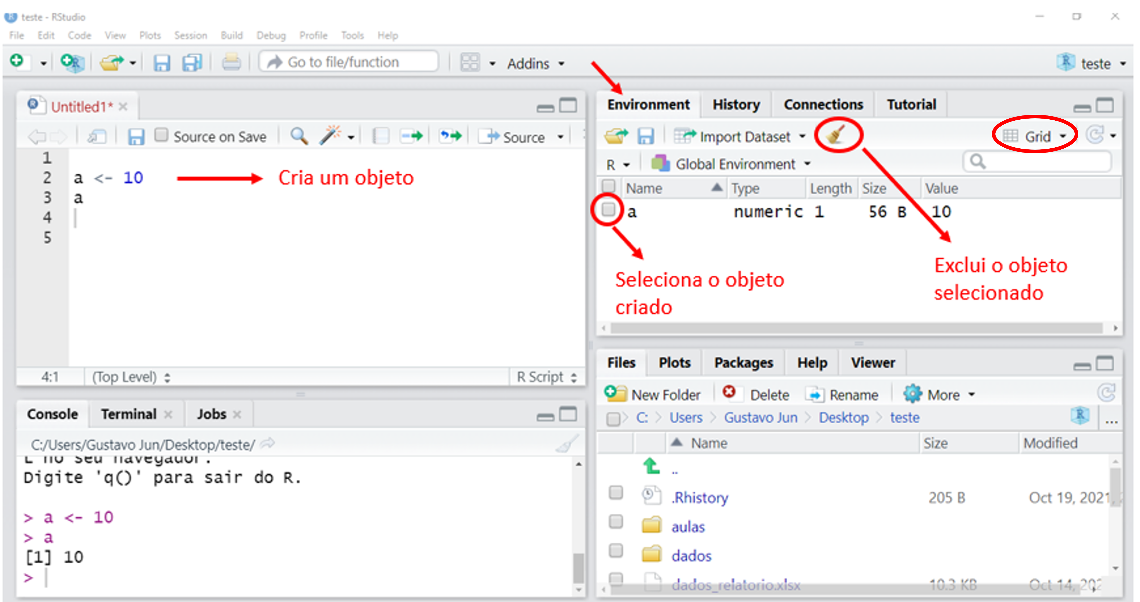 Objetos são nomes que recebem e salvam um determinado valor, comando ou código. Para criar um objeto, utilizamos o operador <-