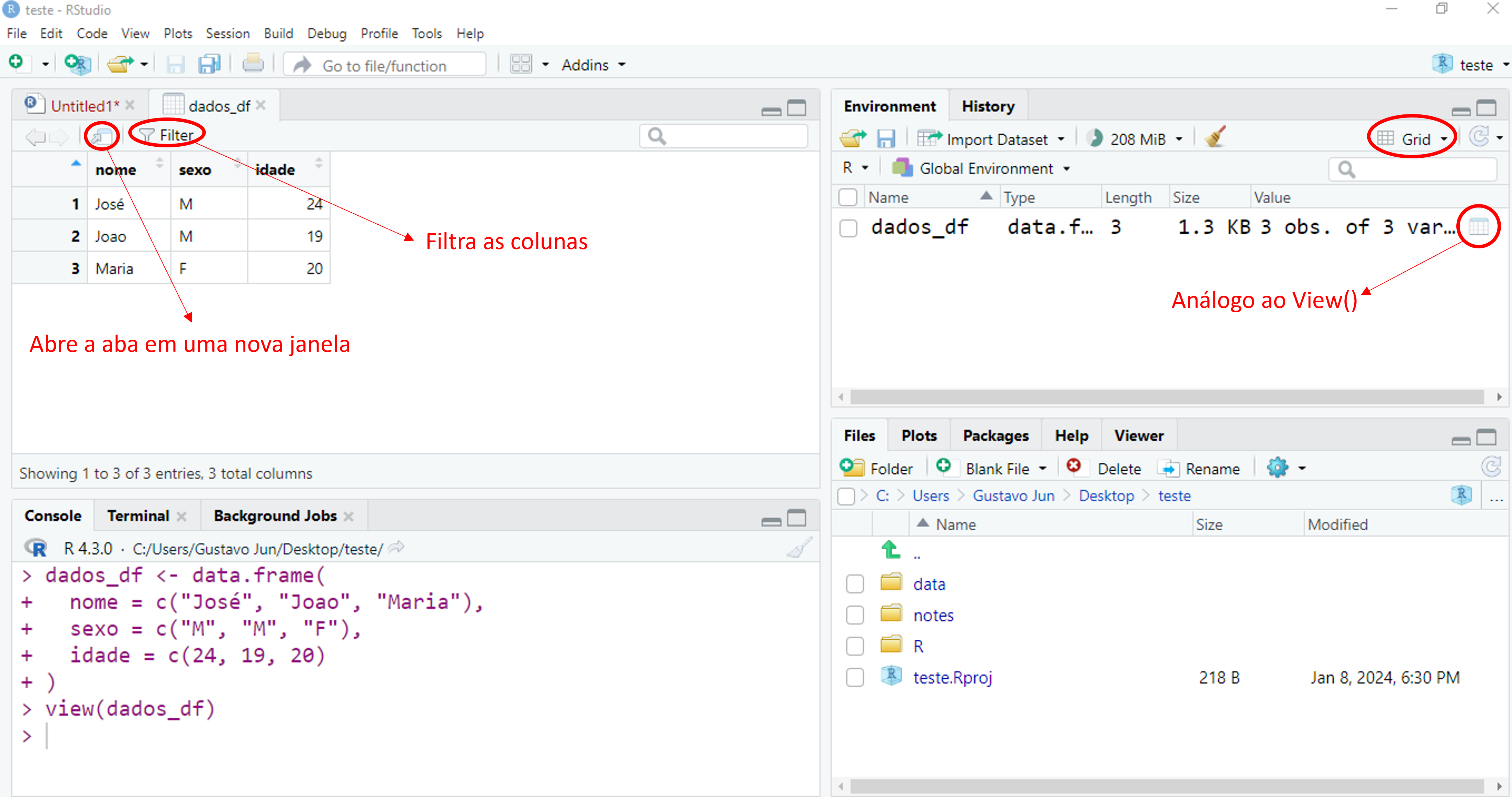 Essas propriedades nos indicam que um data frame tem que receber um conjunto de dados em formato retangular (análoga a uma planilha Excel), com o mesmo número de linhas (observações) em cada coluna (variável), sendo necessário a presença de um nome específico para cada uma das colunas.