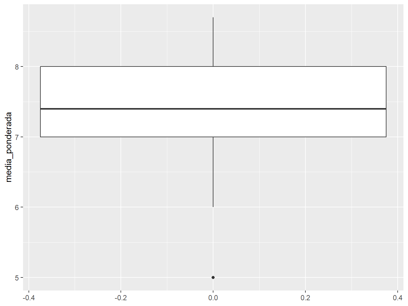Nesse primeiro caso, fizemos um boxplot da média ponderada de todos os alunos. A observação representada por um ponto é um valor atípico aos dados.