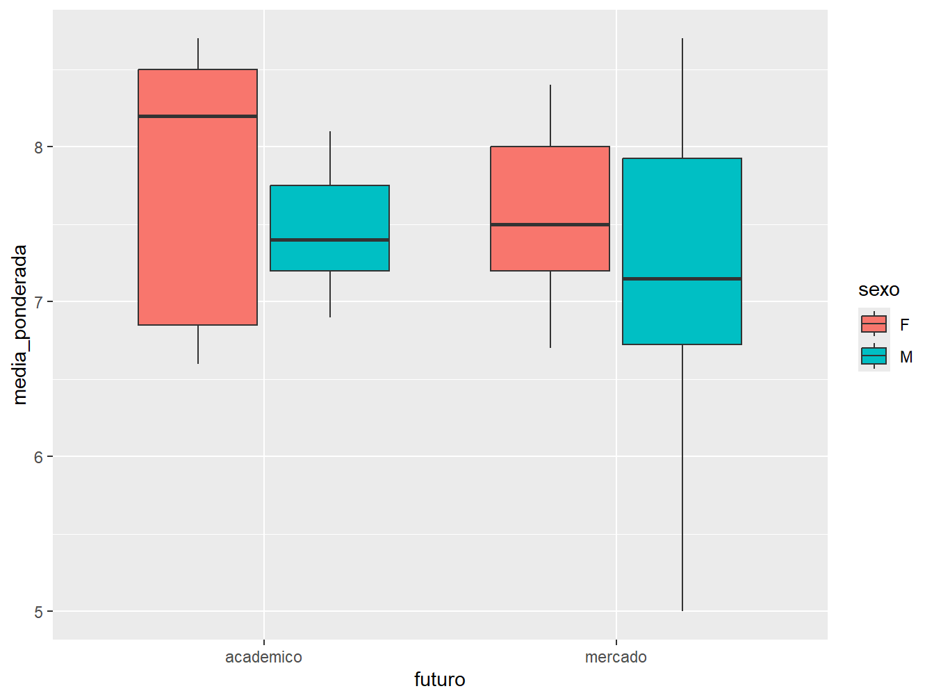 Neste caso, podemos ver a distribuição da média ponderada dos estudantes de acordo com as perspectivas futuras de cada um. Para isso, atribuímos a variável categórica futuro