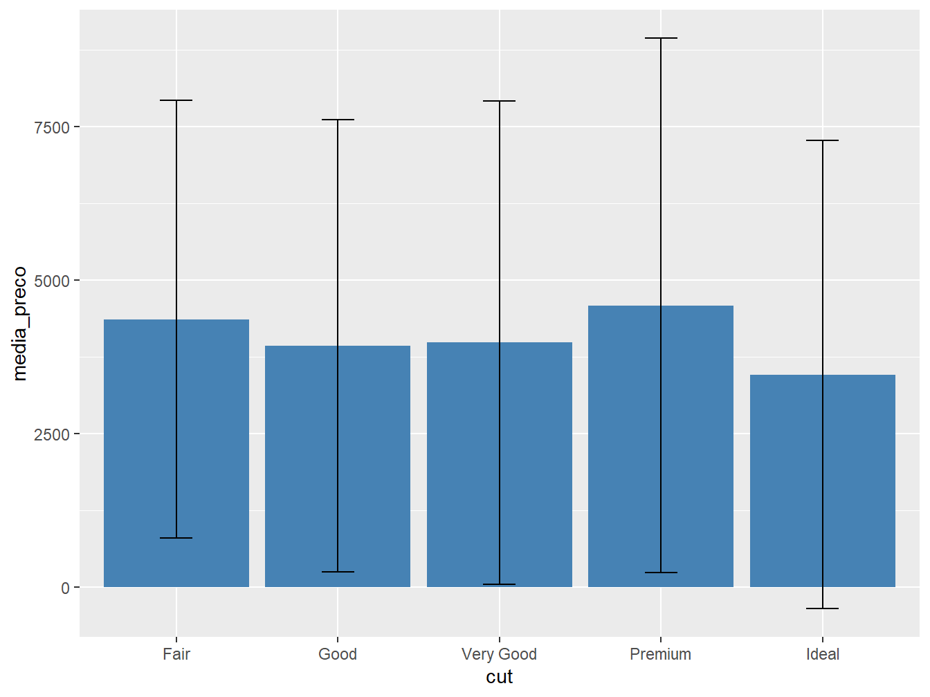 Note que os limites inferior e superior da barra de erro foram construídos a partir da subtração e da soma pela média dos preços de diamantes, respectivamente. Com o argumento width =